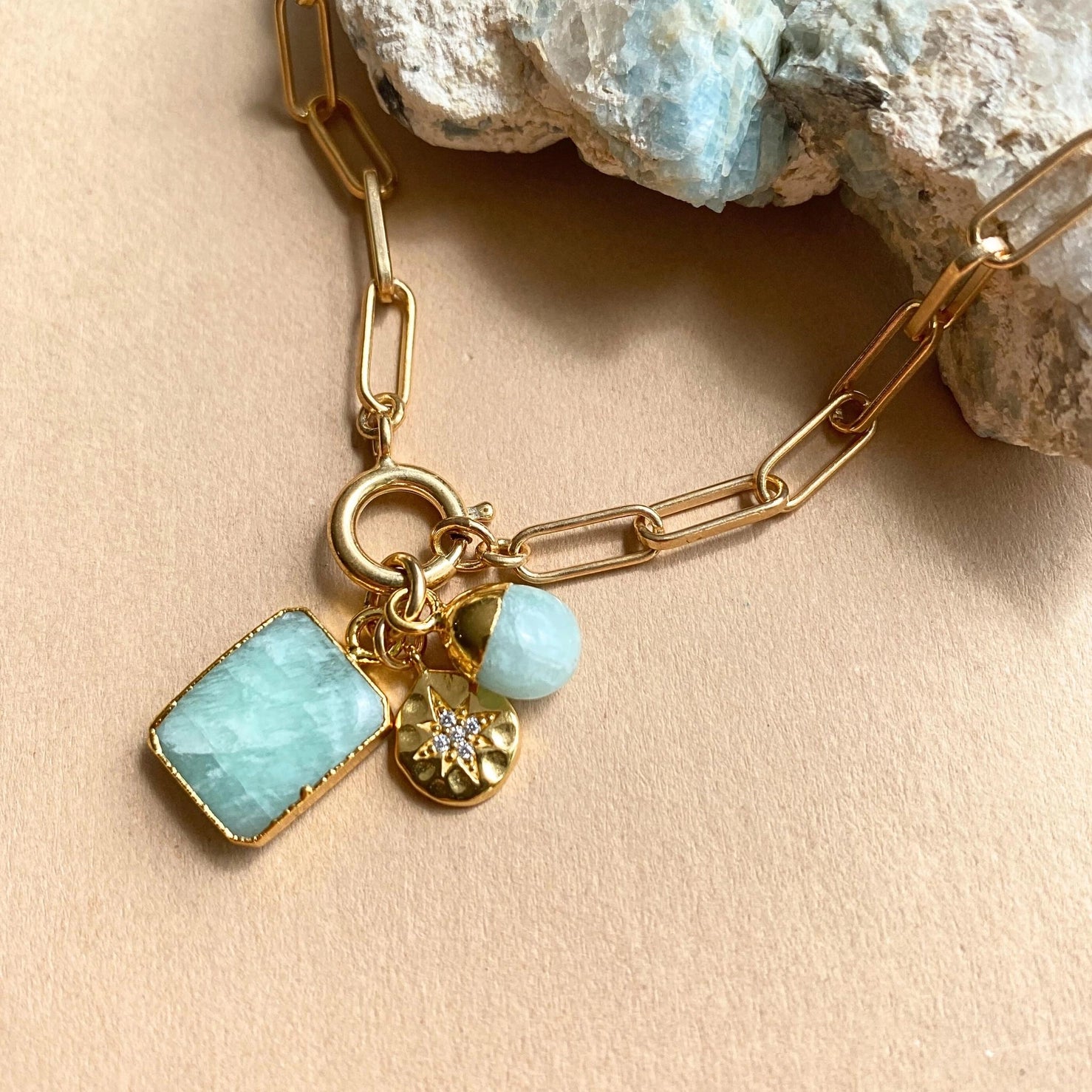 Our bestselling pendants are suspended on a new chunky link chain, featuring a large bolt ring clasp, a perfect statement piece. Amazonite is known as the stone of confidence. The semi-precious stone may have inclusions and clouds, adding to the uniqueness of every piece.
