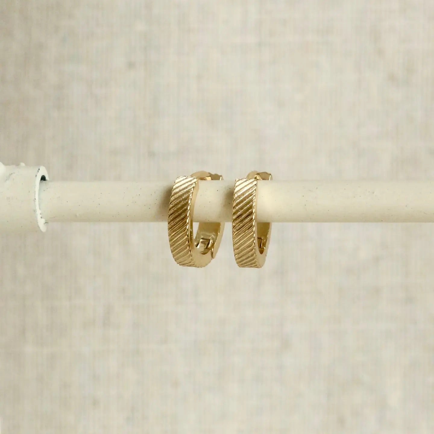 A pair of delicate, etched gold huggie hoops. The perfect minimal hoop with a twist. Hinged for comfort, and suitable for sensitive ears. Look delicate and chic worn alone, but small enough to be stacked for a more dramatic look.