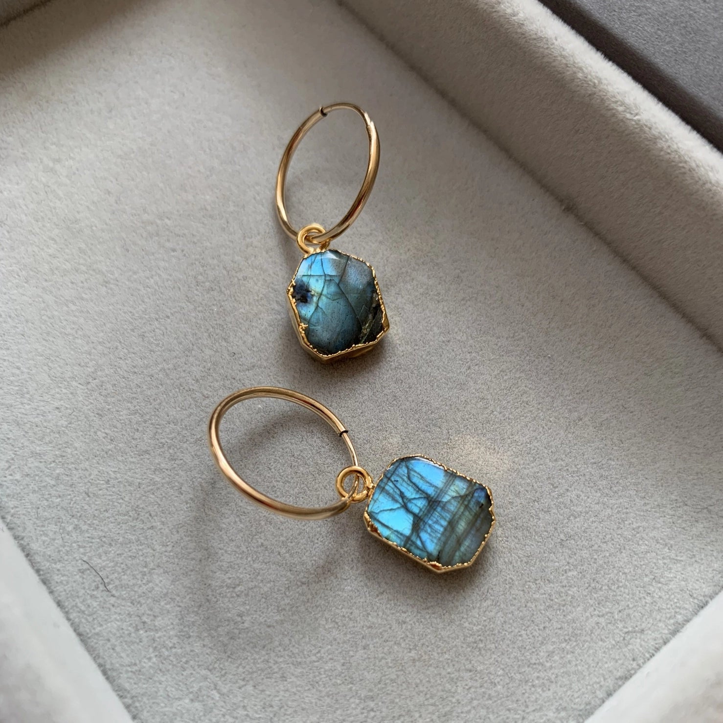 A delicate pair of organic shaped, Labradorite, edged in gold and suspended on gold fill hoop earrings. Labradorite's base colour is dark grey, but when it catches the light, flashes of iridescent colour appear and is thought to have the meaning of adventure. The semi-precious stone may have inclusions and clouds, adding to the uniqueness of each and every piece.