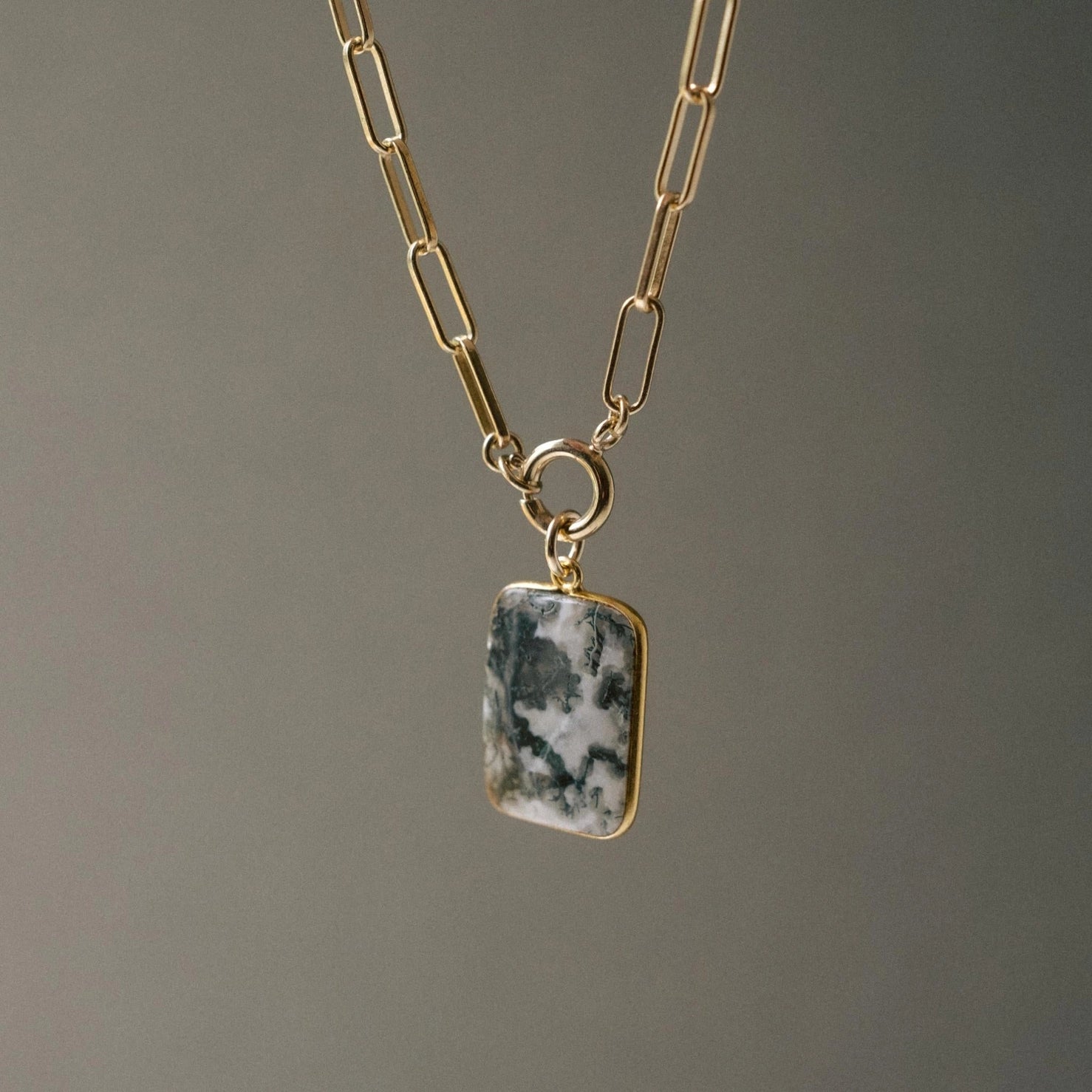 A large organic-shaped, Moss Agate gem slice in gold plating suspended on a chunky link chain with a large bolt ring. Moss Agate is a beautifully patterned gemstone named for its green unique inclusions that resemble moss or foliage. This is a gemstone of ‘new beginnings’. With its links to nature, Moss Agate is said to symbolise growth, renewal, and abundance. It is also thought to encourage a deep connection to the earth and the natural world, fostering a sense of peace and tranquility. Each semi-precious stone will vary slightly and both sides of the pendant may have different and unique markings making this piece truly one of a kind.
